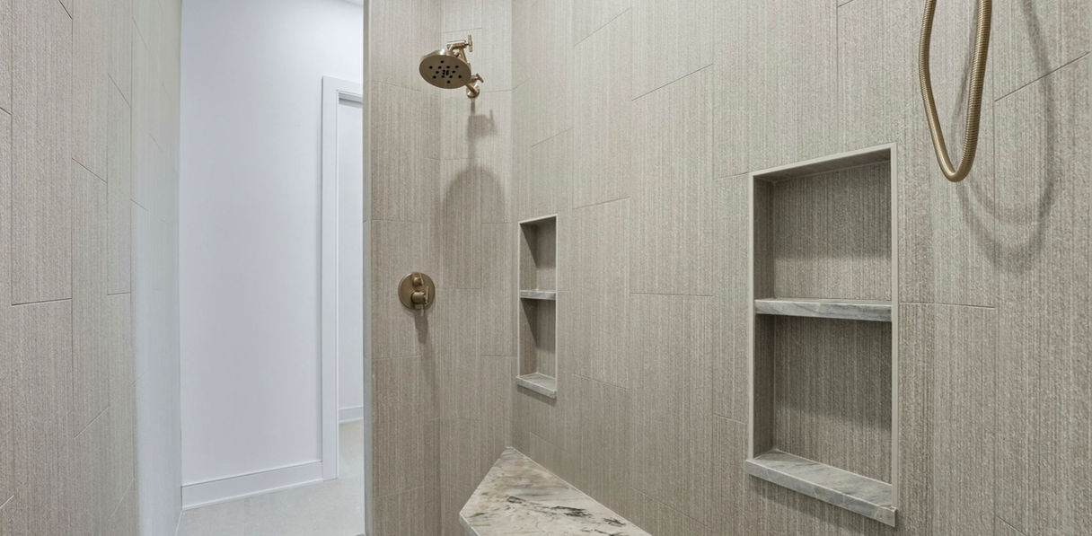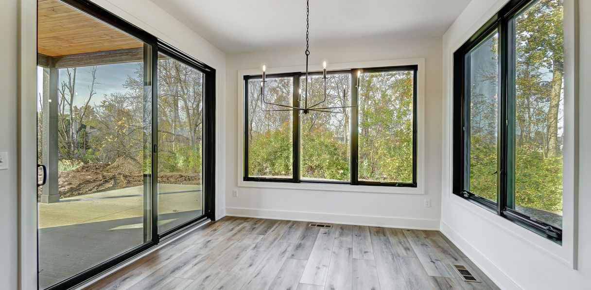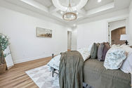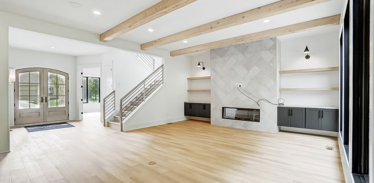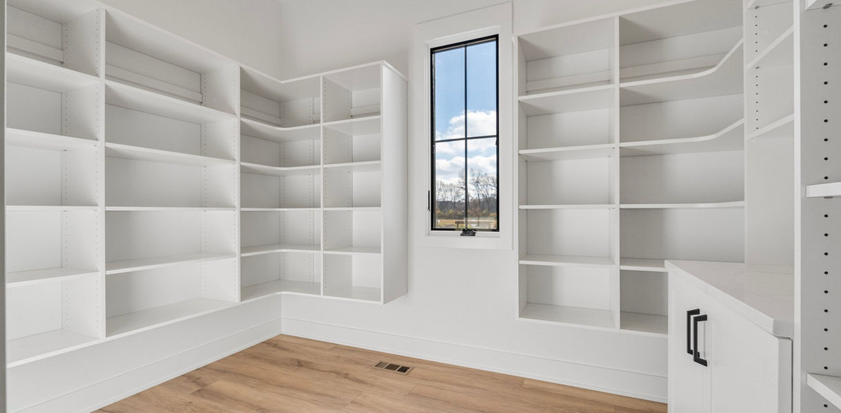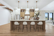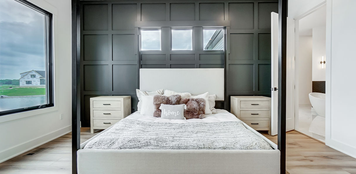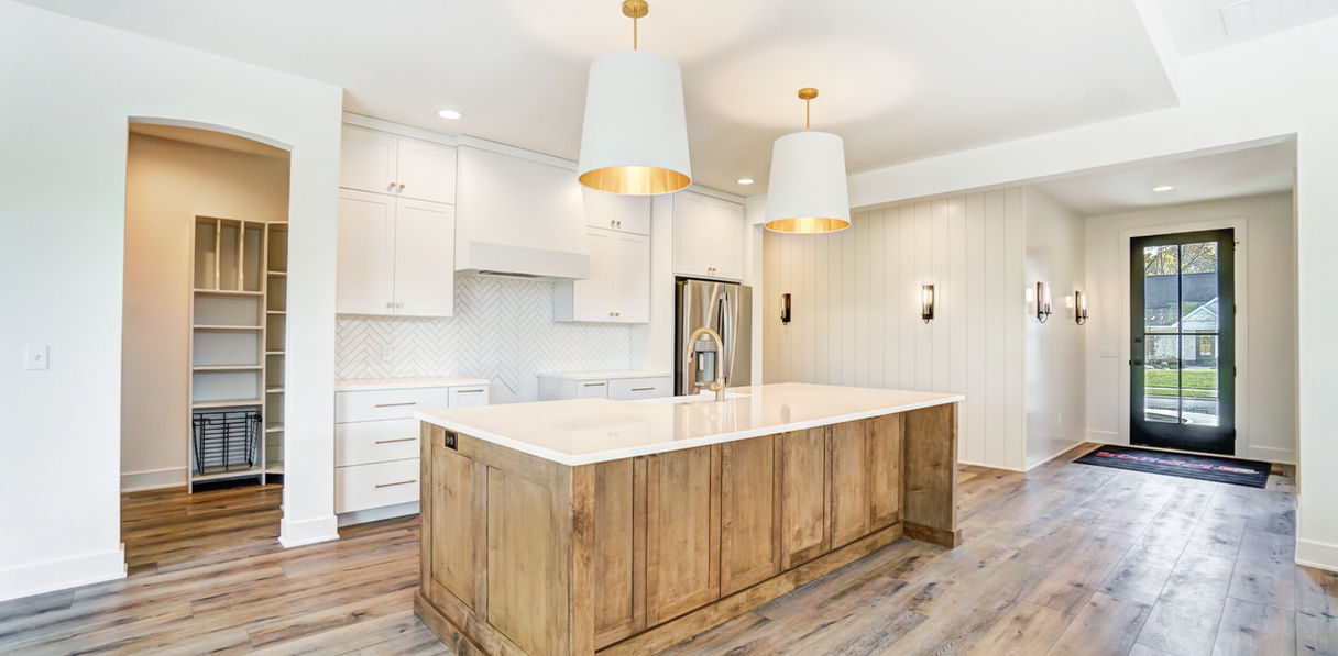Mercato 128 is a sprawling ranch at over 3,000 sq. ft. on one level. The lot features beautiful pond views, while the home is packed with custom features. We used stone and wood accents throughout, arched built-ins and cabinetry details as well as reeded trim accents. Custom lighting and luxury vinyl plank flooring complete this custom build. We designed the master suite to be spacious, luxurious and relaxing, with a wet room featuring a tiled shower, his- and hers closets and a custom, circular coffered ceiling. The covered patio offers a built-in fireplace for 3-season entertaining.